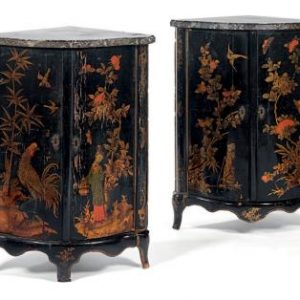 Paire d’Encoignures d’Epoque Louis XV en Vernis Martin à décor de Chinnoiseries