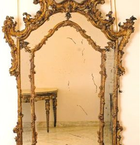Miroir d’Epoque Louis XV en bois sculpté doré à l’Argent-Mixture