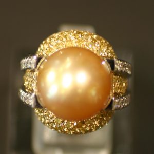 Bague Perle Jaune Pavage Brillants Fancy Yellow et Blancs