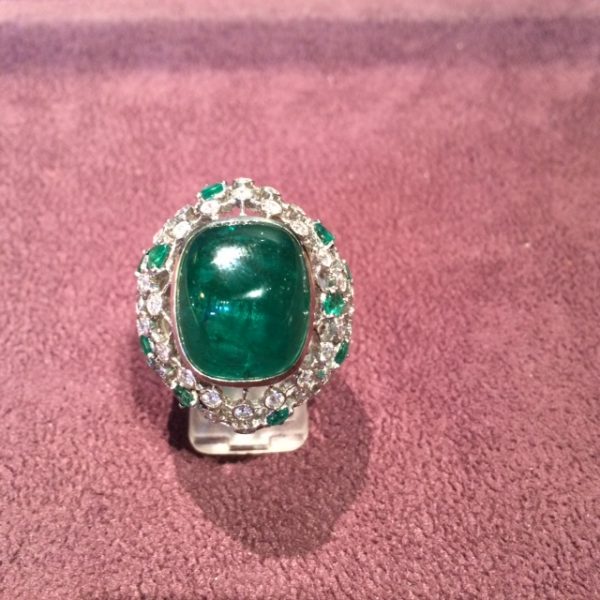 Bague Dome Emeraude Cabochon 17 Cts entouré de Diamants et Emeraudes sur Or Gris