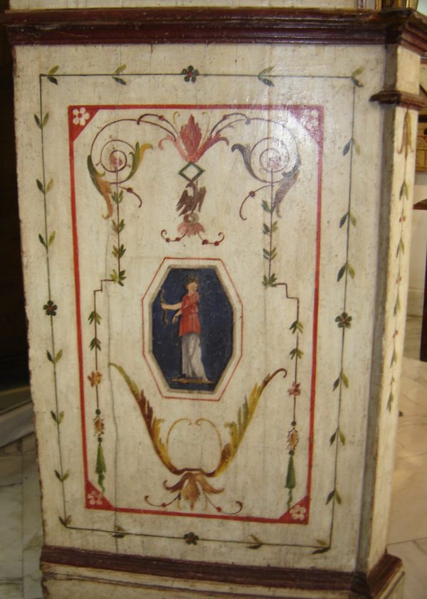 A décor Néoclassique de médaillons et de chimères dans des réserves de feuillages et de volutes sur fond laqué blanc .