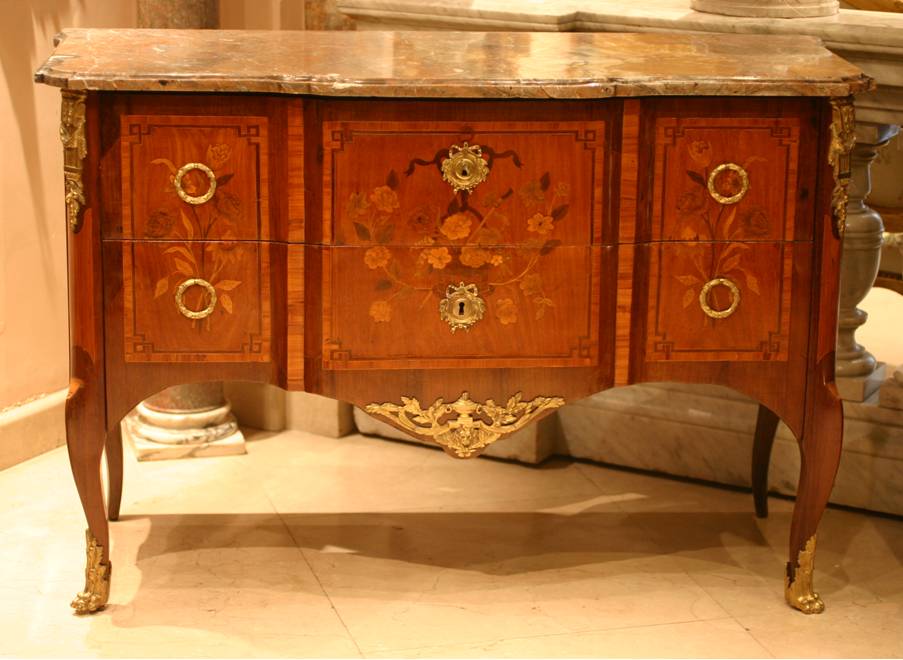 Ouvrant par deux tiroirs sans traverse , façade mouvementé agrémenté par une riche marqueterie de Fleurs , marqueterie géométrique sur les deux cotés  .