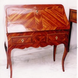 Elle ouvre par deux tiroirs sans traverse à décor d’un panneau de marqueterie central de feuillages surmonté par un tiroir en ceinture séparé par une traverse , à décor d’une grecque de feuillages .