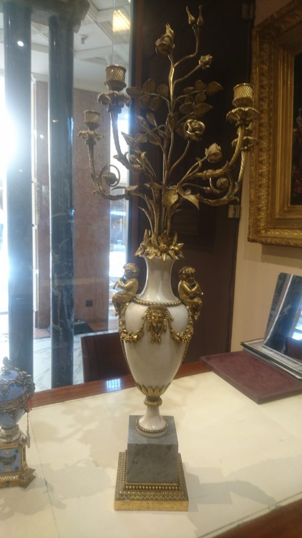 Paire de Candélabres Aux Faunes en Bronze Ciselé Dore et marbre Blanc Statuaire