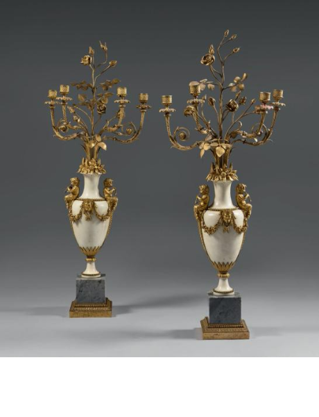Paire de Candélabres aux Faunes , en Bronze Ciselé Dore et marbre Blanc Statuaire , d(Epoque Louis XVI