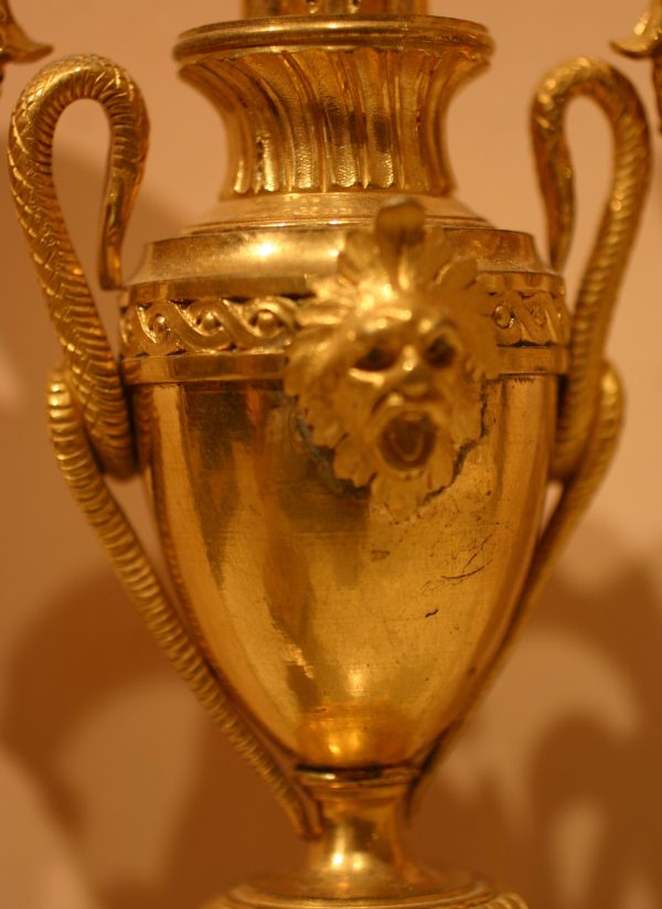 Paire de Candélabres en Bronze Ciselé , Dore et marbre Blanc statuaire , d’Epoque Louis XVI , reposant sur un socle en marbre Blanc Statuaire , à décor de serpents et de Mascarons .