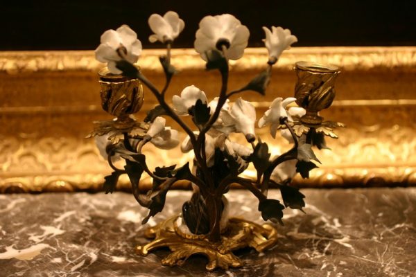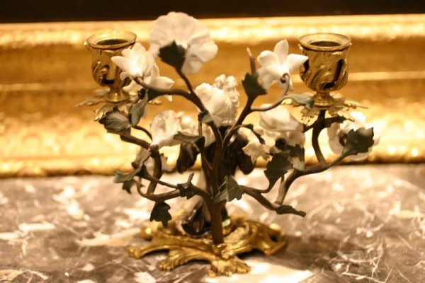 Paire de Candélabres Porcelaines de Meissen , et Bronze Ciselé , Dore , Paris d’Epoque Louis XV , reposant sur des terrasses Rocailles en bronze ajouré et doré , à décor d’arbres fleuris enrichis de Fleures en porcelaine de Vincennes .