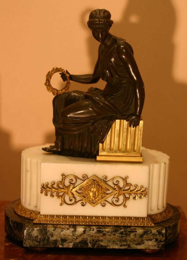 Pendant de Groupes en Bronze Ciselé , Patiné et Doré , sur socles en Marbre Blanc Statuaire et Vert de Mer , d’Epoque Louis XVI ,